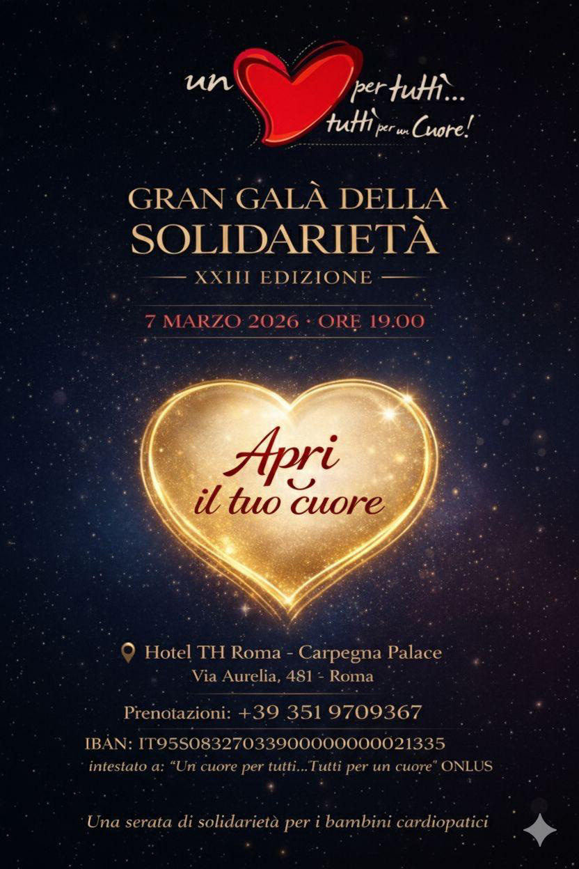 SAVE THE DATE 07 Marzo 2026 ore 19.00 XXIII Gran Gala’ della Solidarietà, per i bambini cardiopatici e le emergenze cardiologiche, si terrà presso il TH Carpegna Palace Via Aurelia 481.